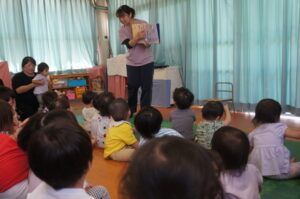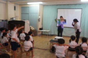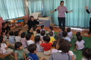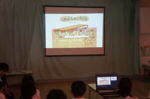 「てをつなぐ」と言う絵本では、一人の男の子が様々な職業の人たちと手が繋がり、外国の人たち…そこから動物や海の生き物と繋がっていくという素敵な絵本内容を楽しんで見ていました♪