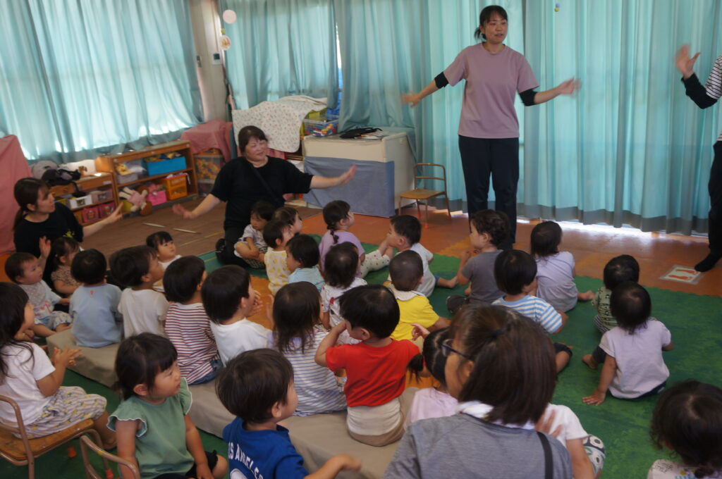 「ちいさな いのち」のお歌では可愛らしい身振りもあり、一緒に楽しむ姿や0歳児・1歳児の真似っこをしていました♪