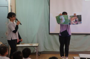 幼児さんでは「なかま」とは何かな?というテーマから間違い探しのクイズを行いました。りす組さんは色の違うトマトを見せると手を挙げて「赤と…黄色と…緑のトマトがある!」と答える姿があり、きりん組さんでは犬種の違う犬を見て「耳が違う!」「毛の色が違う!」と気づいたことを言葉にして出してくれました。ぞう組さんは少し難しいものでしたが「車いすの人と…元気な人がおる!」「外国人の人は目が青い…もう一人の人は黒い!」と年長さんらしい発言がありました。違いはあっても「トマト」「犬」「人間」と全て同じ仲間だよねと伝えています。