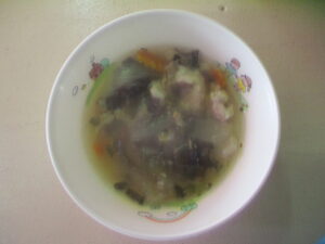 最後にはみんなで「へいわってすてきだね」の歌を唄い、また今日は8月6日の広島での原爆投下の日でもあるため、お話をしました。給食では「すいとんスープ」を提供していただき、戦時中はお米も取れなくて小麦粉もなくてトウモロコシの粉や糠を使って、すいとんを作っていたんだよと給食の際に伝えています。