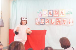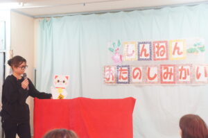 巳年のみーちゃん、午年のうまくんの人形劇を観たり、招き猫といっしょに新年の手遊びを楽しみました。