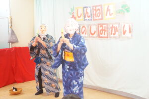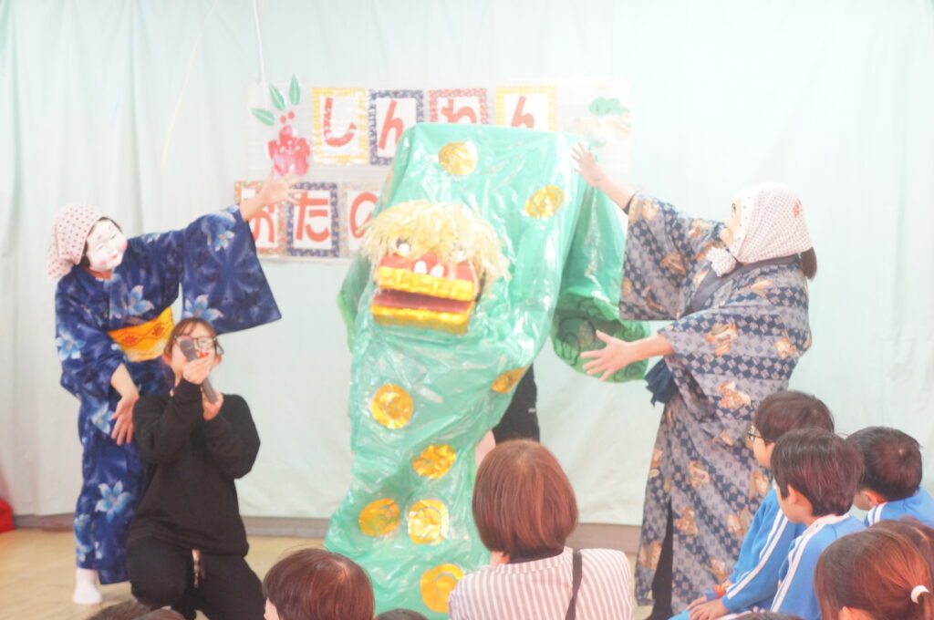 ひょっとこ、おかめ、獅子舞もきてくれてお正月遊びの寸劇を観ました。子どもたちも興味を持って見入っていましたよ。