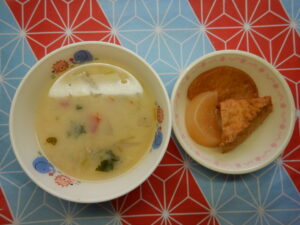給食は3~5歳児クラスはお正月の伝統行事食、おもちに見立てたジャガイモのお雑煮と炊き合わせを頂きました。