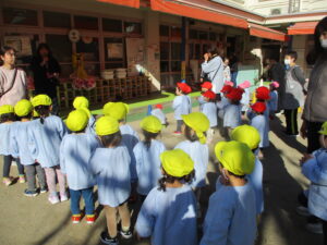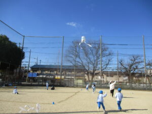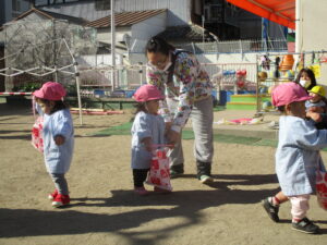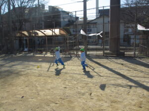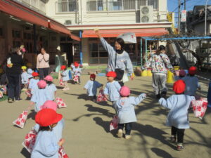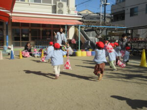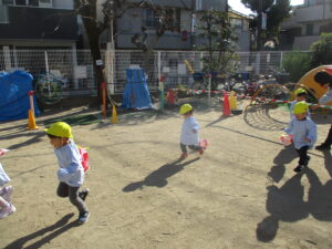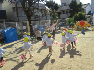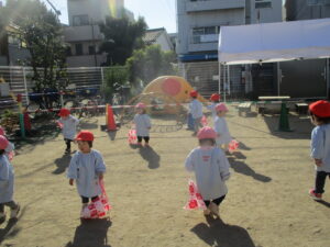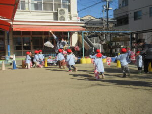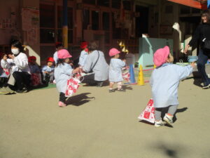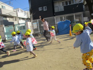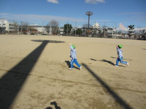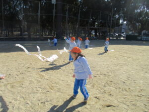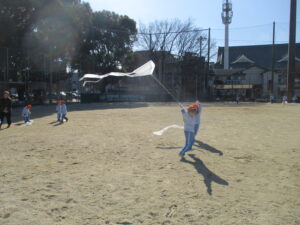公園内に到着するとグラウンド内はお日様に照らされ、元気な声を出して体操をする姿や保育士と共に走る場所を確認し、自分で作った手作り凧を持って走りました!!「先生!見て~」「僕の凧高くあがってる~?」「私のも見て~!」と色んなところから声が聞こえてきましたよ♪ 年齢ごとでひもの長さも違い、それぞれの身長にあった長さの凧で楽しむ姿があり、保育士もとても楽しかったです。