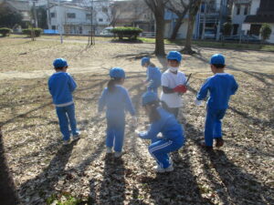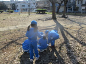 5歳児さんは保育所の散歩で利用している平野公園のゴミ拾いをしました。軍手をはめて気合い十分の子どもたち!!公園に着くと散歩とは違い、掃除をするという目的から遊具で遊ぶのではなく「ゴミ拾い」をしました。公園の入り口から「先生!タバコがめっちゃ落ちてる!」「ジュースのゴミかな…?」と言葉にする姿が見られました。