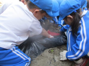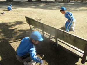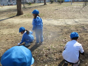 清掃前に子どもたちには「ガラス・ライター・マッチ・ガスボンベ・刃物類」は見つけても保育士に知らせてね。という約束の中で掃除を行いました。木の枝やお菓子の袋を見つけて次々にゴミ袋に入れていく姿がありました。公園の入り口ではタバコを保育士が拾い、子どもたちから「先生!ガラスがある」と教えてくれ、破片もたくさん見つかりました。