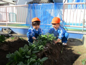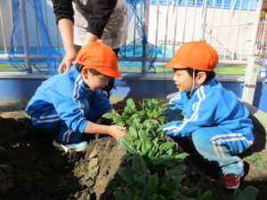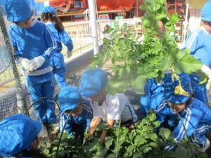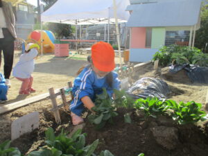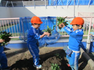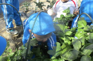 午後からは菜園活動として「大根・サニーレタス」の収穫を行いました。自分たちで植え、毎日の水やりや観察を楽しみ「見てみて!葉っぱが増えた!」と言葉にしたり、友だち同士で「葉っぱの模様が違うな」と話し合う姿や「いつごろ食べられる?」と収穫に期待を持つ姿もありました。