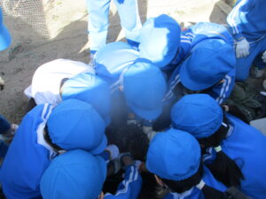 大根を抜くと、思っている以上に根が張っていて力を入れる子どもたち。「抜けへ~ん・・・」「絵本の大きなカブみたいにみんなで引っ張る?」と会話をする姿が微笑ましかったです。大根が抜けると「大きい!!」「すご~い!」とふっくらとした見た目に保育士も収穫の嬉しさを感じました♪ サニーレタスは慎重に土を掘っていき、優しく抜く事ができて青々としたレタスに「サラダの匂いする~」「何にして給食にでるんかな?」と給食への提供を楽しみにしています。