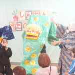 0~5歳児クラスのお友だちが集まりみんなで新年お楽しみ会に参加をしました。 巳年のみーちゃん、午年のうまくんの人形劇